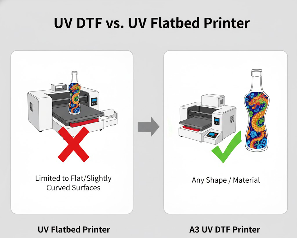 UV DTF printing uses a film transfer process, while UV flatbed printing directly prints onto materials. DTF is often preferred for fabrics and small batch runs, while flatbed printers are ideal for large-format rigid surfaces.
