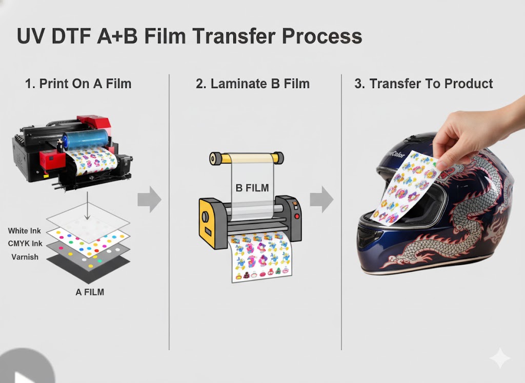 A3 UV DTF (Direct-to-Film) printing represents a significant evolution in digital decoration. This process utilizes specialized UV LED inks to print a design—complete with a white base, color, and varnish—onto a coated 'A' film. This print is then laminated with a 'B' film, creating a robust, adhesive-backed transfer sticker.
