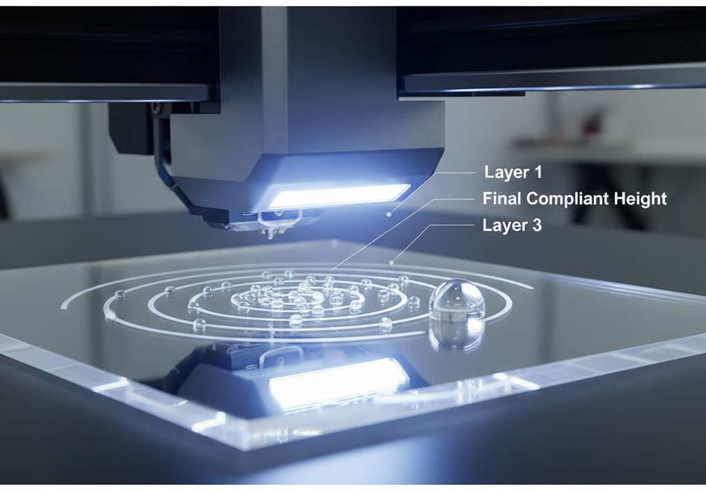 3. The printhead repeats this process, layering and curing varnish until the dot reaches the ADA-required height (between 0.059 and 0.063 inches).