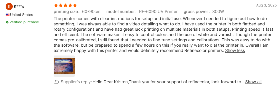 4. The printer comes with clear instructions for setup and initial use. Whenever I needed to figure out how to do something, I was always able to find a video detailing what to do. I have used the printer in both flatbed and rotary configurations and have had great luck printing on multiple materials in both setups. Printing speed is fast and efficient. The software makes it easy to control colors and the use of white and varnish. Though the printer comes pre-calibrated, I still found that I needed to fine tune settings and calibrations. This was easy to do with the software, but be prepared to spend a few hours on this if you really want to dial the printer in. Overall I am extremely happy with this printer and would definitely recommend Refinecolor printers