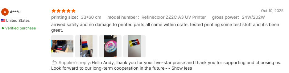 QUALITYASSURANCE:Refnecolor have 16+ years production experiencesOur printers use Original Epson Printhead and havepassed CE,FCC, RoHS, CCC,I509001 and sGscertifcates.We conduct strict quality test beforeshipping to ensure the best quality of our printers.