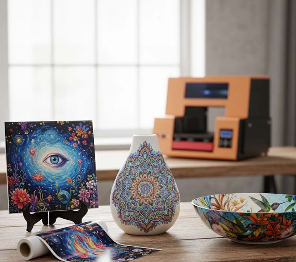 A UV Ceramic Decal Printer redefines the customization process to avoid the high setup fees, frustrating scrap rates, and long lead times of traditional ceramic decal production . It is a system that uses UV-curable inks to print intricate, vibrant designs onto a special release film (Film A). The printer then automatically laminates a positioning film (Film B) over the print, creating a robust, ready-to-apply "UV transfer sticker" or decal.