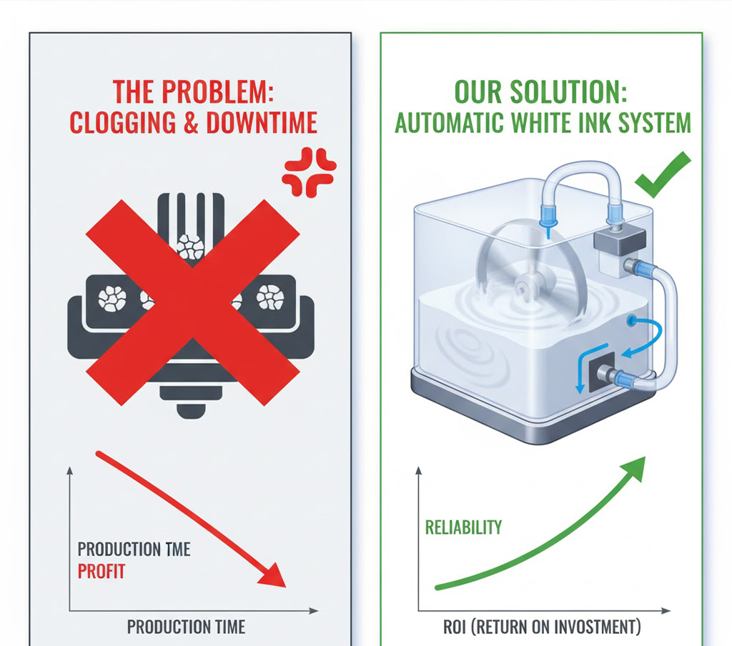 A: This is less about "how you maintain it" and more about "how the machine maintains itself." Our uv flatbed ink printer models are equipped with an automatic white ink circulation and stirring system. This system continuously circulates the ink through the lines to prevent the heavy titanium dioxide pigments from settling.