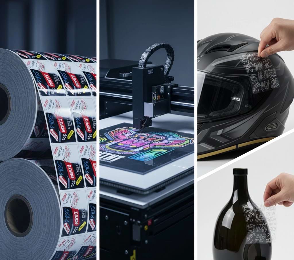 1.Print (A Film): The printer first lays down a layer of adhesive, followed by the color inks (CMYK + White), and finally a layer of varnish onto a specialized release liner (Film A). From our factory experience, we recommend a high-quality PET Film A of around 50-75μm thickness; thinner films are notoriously prone to wrinkling during lamination.